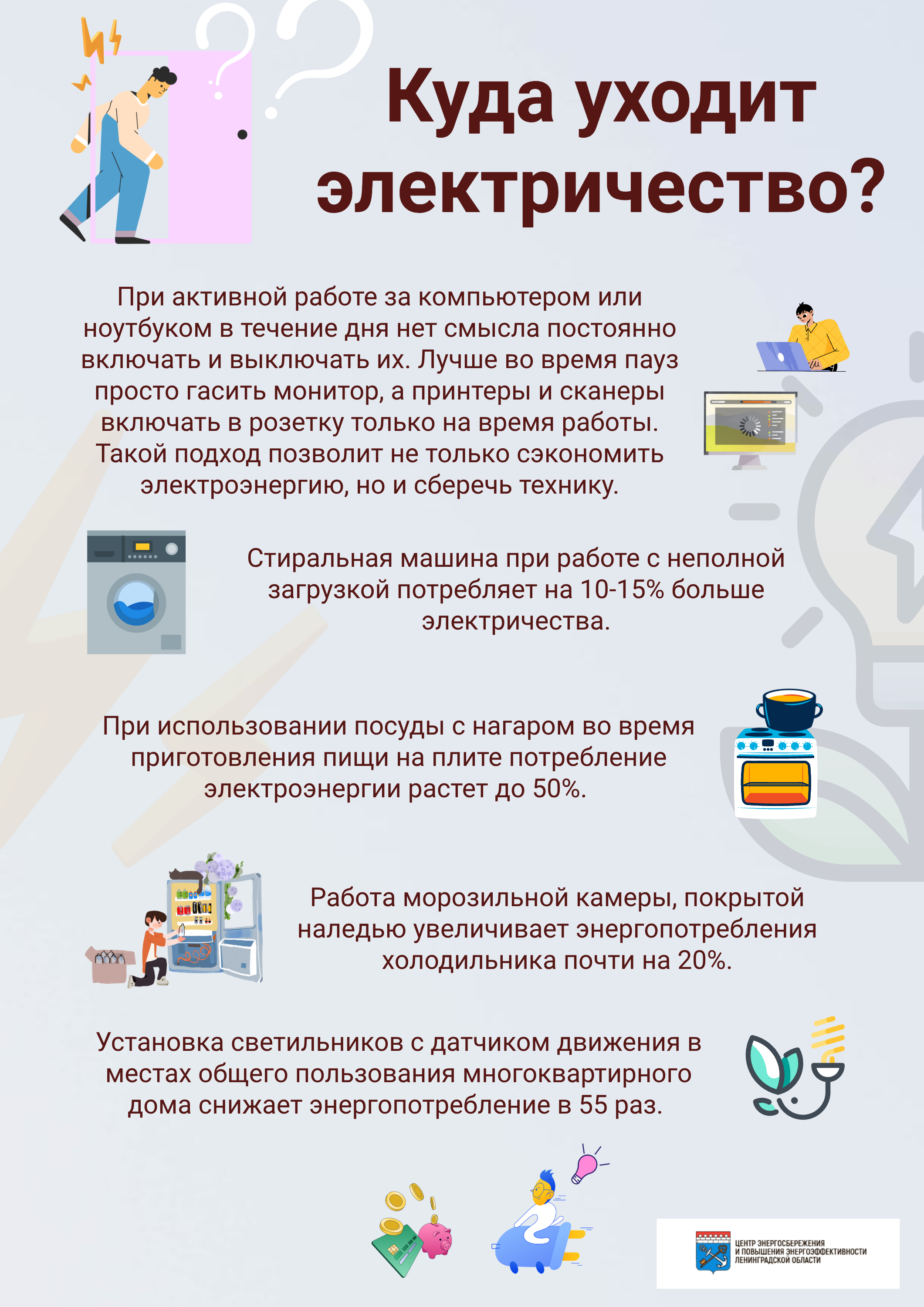 ГКУ ЛО «Центр энергосбережения Ленинградской области» подготовил для вас наглядную памятку, которая покажет, куда на самом деле уходит электричество в вашем доме. Узнайте, как небольшие привычки могут привести к большой экономии!